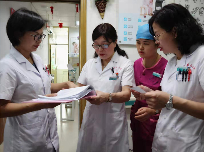 ▲早会前,徐彩临主任查看前一天入院产妇的检查报告