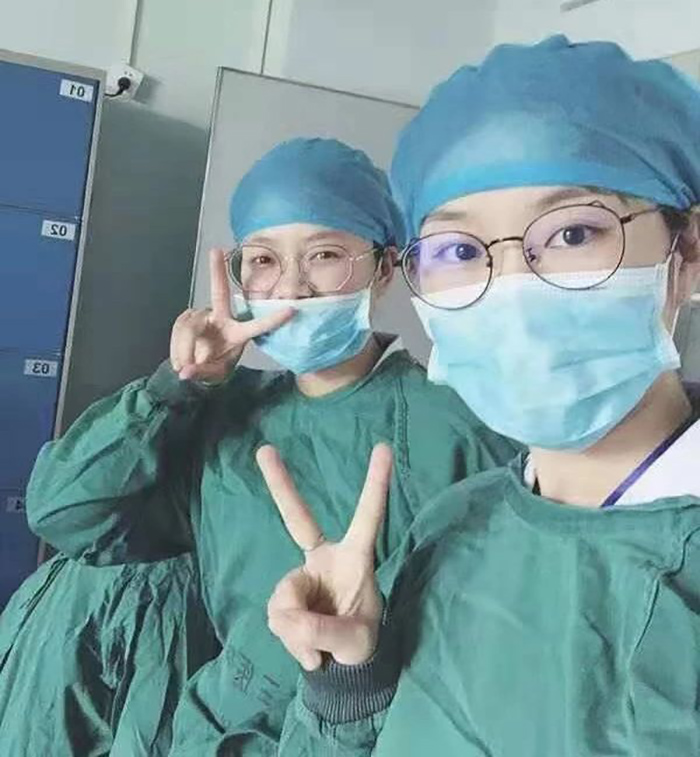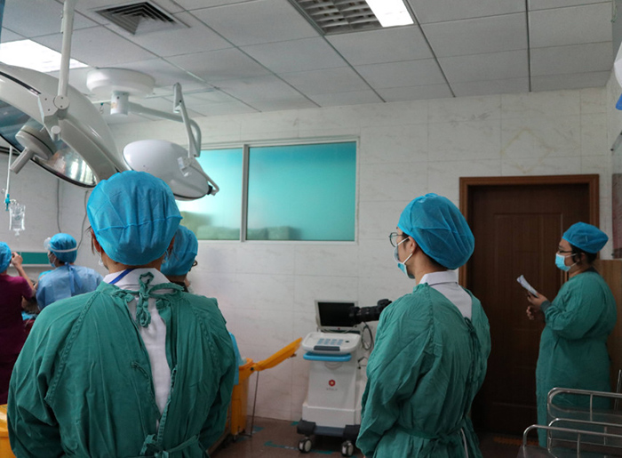 查房后,徐彩临主任开始了每天的手术。术前,护士长帮两位体验者穿戴好口罩帽子及隔离衣,并讲解在手术室的注意事项。▼