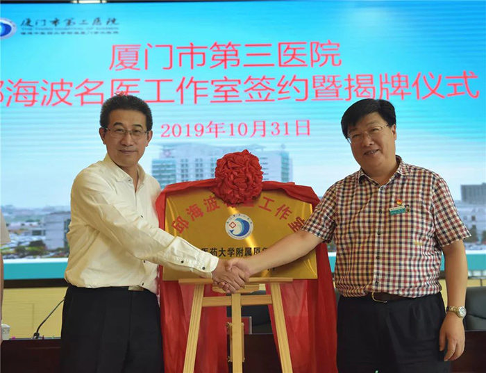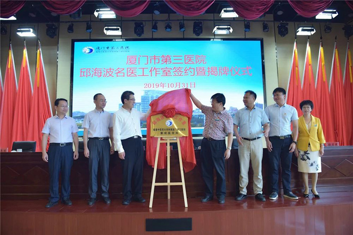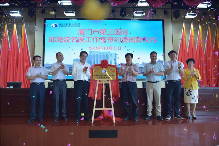 邱海波教授及其工作室的专家、厦门市卫健委副主任陈文锋、同安区副区长曾繁振、同安区委组织部二级主任科员陈成栋、伦理片 党委书记彭月芗、院长郭之通等班子成员、医务人员参加了揭牌仪式。