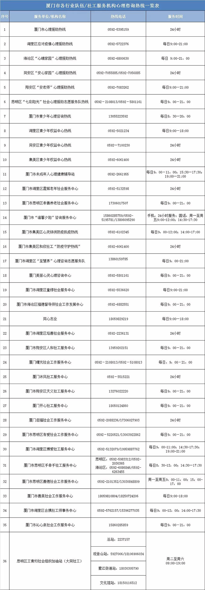 连日来,新型冠状病毒感染的肺炎疫情给大众带来了诸多压力。 为解决广大市民在疫情期间产生的一些心理上的困扰,厦门市应对新型冠状病毒感染肺炎疫情工作指挥部心理危机干预小组组织全市50余条免费心理援助热线,为大众提供全方位的心理支持、疏导和干预服务。现将这些心理援助热线公布给广大市民群众。 点击看大图更清晰▼