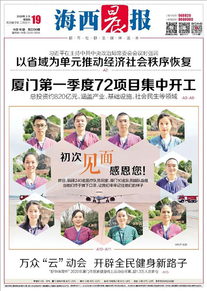 3月18日,国家紧急医学救援(福建)队、福建护理队(方舱)、福建支援湖北第九批医疗队共240人返闽。其中,出征东西湖方舱伦理片 的伦理片 副主任护师、呼吸一科护士长王赫铭,随同福建护理队队员胜利完成使命,乘坐包机返闽。