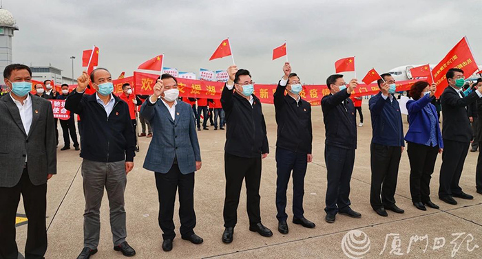 省委常委、市委书记胡昌升,市长庄稼汉,厦门大学党委书记张彦,校长张荣前往机场迎接医疗队。