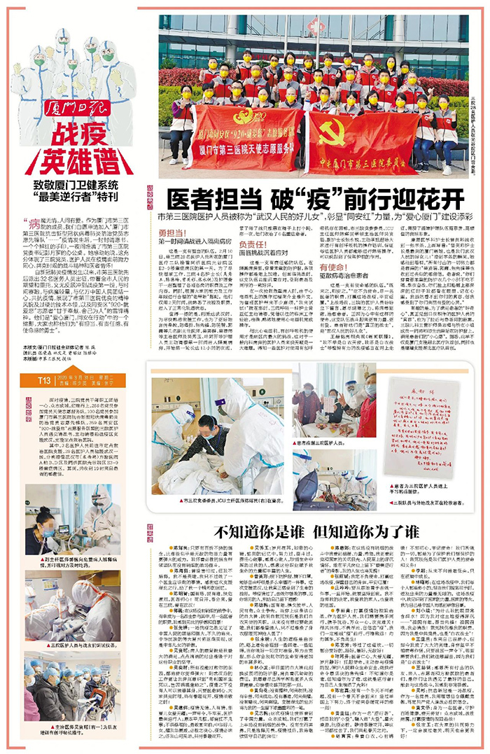 陈明智:国有殇,民有难,扶危渡厄,医者初心!花自开,春会来,爱在三院,爱在武汉! 郭巍:在这场没有硝烟的战争中,有幸成为一名战士参与其中,尽一名医者的职责,我感到无比的骄傲和自豪! 张先锋:一场抗疫之战见证了中国人民的团结和强大,不久的将来,中华民族的伟大复兴将逐渐实现,这是中华儿女的骄傲。 吴资瑶:病人的康复就是我最大的满足,点点滴滴的付出是缘于对这份职业的坚守。 吴奕群:所有没能打败你的东西,都将使你变得强大!到武汉后的工作更让我深刻意识到“苟利国家生死以,岂因祸福避趋之”,疫情之下没有人可以独善其身,只要医患同心、大家共克时艰,终有春暖花开,疫情消散之时! 吴建伟:疫情无情,人有情,华夏儿女爱无疆;一声号令,千军至,医护最美逆行人;原本平凡躯,却肩扛不凡事;不畏路艰险,勇敢直向前;中华好儿女,耀我华夏威,必胜之决心,疫情必诛之;还我山河无恙,共待春暖花开。 吴秀玉:岁月荏苒,如素的心境,铭刻的记忆中,努力过,奋斗过。责任心做事,感恩心做人,珍惜生命中帮助过我的人,感激这份职业赋予我生命的力量和丰富的人生。 曾英彩:脱下防护服,摘下口罩,能够自由呼吸是多么幸福的一件事。这次支援武汉,让我真正感受到了生命的脆弱。等疫情过了,去做你想做的事,见你想见的人,别给自己留下遗憾! 陈德梅:国有难,操戈披甲,人民有危,众士争先。当穿上这身洁白的白大褂,就明白救死扶伤是我们白衣天使的天职。从来没有想过要做英雄,我们都是普通人,只不过是换了身衣服跟死神抢人罢了! 张永锐:人生的道路是曲折的,路上难免会碰到一些困难,一些阻碍,当你做好一切应对准备,努力去克服,那么你会发现你的生命变得更加的丰富多彩。 林小龙:平日里的白大褂此刻换成密闭的防护服,肩负着沉甸甸的责任。我愿意尽己所学帮助更多人恢复健康,迎接樱花盛开的那一刻。 黄菊花:没有播种,何来收获;没有辛苦,何来成功;没有磨难,何来荣耀;没有黯淡,何来辉煌。支援湖北的经历将为我的一生留下浓墨重彩的一笔。 吴志梅:这次疫情让世界看到了中国力量。众志成城,我们打赢了上半场没有硝烟的战争。没有生而英勇,只是选择无畏,疫情过后,我将继续坚守自己的岗位! 陈惠娜:在这场没有硝烟的战斗中我看到温暖、力量、希望,我更看到党和国家的关切目光、人民至上的深沉情怀。能在平凡岗位上留下“最美逆行者”的身影,我的人生也将无愧! 张丽斌:我定不负使命,打赢这场战疫,保重自己的身体,平安归厦! 庄吟吟:要从容地着手去做一件事,一旦开始,就要坚持到底。我不后悔我的决定,我爱我的家人,也爱我的祖国。 李丽青:打赢疫情防控阻击战,作为医护人员,我们需要携手同行,携手抗击,万众一心,攻克难关!栉风沐雨,不畏浮云,自信击“疫”,我们一定能破“疫”前行、行稳致远!灼灼其华,不负此生! 陈艺芳:等过了这道坎,一切都会变好的,超好,爆好,无敌好! 叶阿芬:医者仁心,大爱无疆,岁月静好!扛起使命,主动参与疫情防控,保护人民群众生命安全,做执行命令最坚决的急先锋!不知道你是谁,但知道你为了谁,这就是逆行者!为自己人生增添了光彩! 陈密真:没有一个冬天不可逾越,没有一个春天不会到来!经过举国上下努力,终于迎来春暖花开的那一刻! 黄亚红:作为一名“逆行者”,把自我的“小爱”,融入进“大爱”,星火燎原,抗疫必胜。静待春暖花开,等这一切都过去了,我们共赴春天之约。 林育富:身着白衣,心有锦缎!不忘初心,牢记使命!我们所做的一切,都是为了保护我们想保护的人!救死扶伤是我们医护人员的使命和义务! 李超:从来不向苦难低头,只在逆境中成长。 林曙彬:在这场战疫中,我们每个人都是渺小的,但当我们握紧双手时,迸发出来的力量是无限的。这场战疫中,我见识到了国家的力量,国家的伟大,我为自己是中国人而感到骄傲自豪。 刘小婧:“为什么我的眼里常含泪水?因为我对这土地爱得深沉……”祖国有难,吾当先锋!祖国召唤,我必请战!救死扶伤是我的职责,因为我是中共党员,也是“白衣战士”! 王亚兰:本来自己很渺小,但如今我成了大大的英雄,身穿盔甲不怕病毒作怪,只要祖国一声令下,哪里需要我们,我们就往哪里去,因为我们是“白衣战士”! 王赫铭:感恩所有付出的队友、亲人、志愿者和方舱伦理片