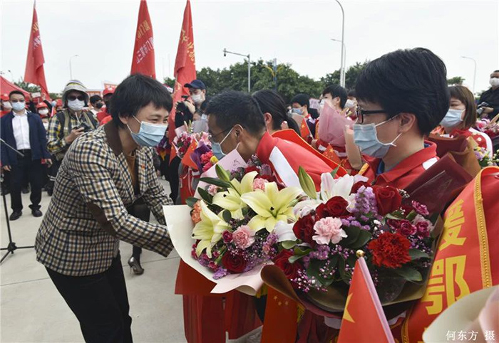 在仪式上,区委书记王雪敏,区委副书记陈高润,区委常委、宣传部长林国财为援鄂医护人员颁发“战疫英雄大礼包”。