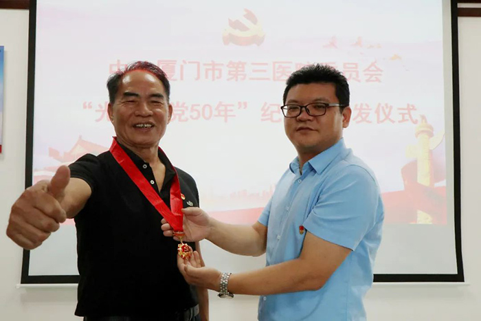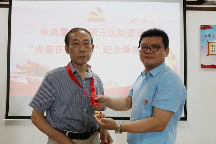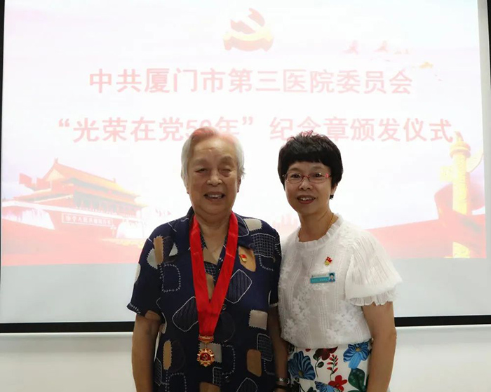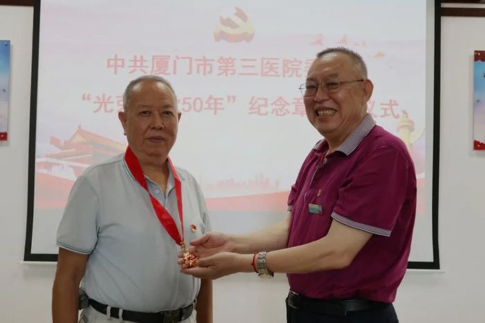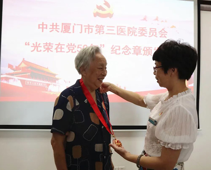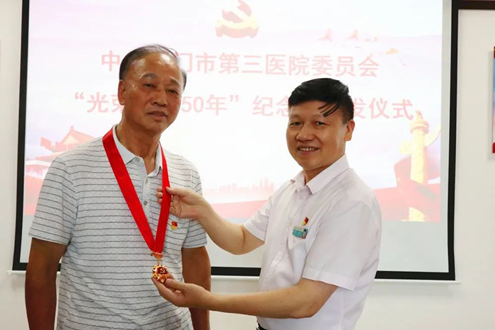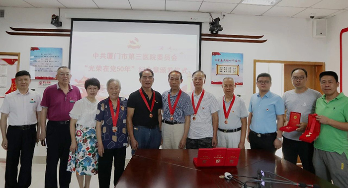 6月18日,伦理片 举行“光荣在党50年”纪念章颁发仪式。市第三伦理片 党委书记彭月芗,党委副书记、院长彭小松,党委委员、副院长高斌,党委委员、副院长黄建隆等为党龄50年的退休党员颁发纪念章。