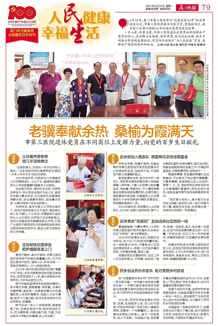 一日入党,终身为党。市第三伦理片 退休老党员始终保持共产党员的初心,在为群众送健康、助学济困、助力社会治理、助力乡村振兴等领域发挥余热,用实际行动践行“为人民服务”宗旨,诠释共产党员的使命和担当。