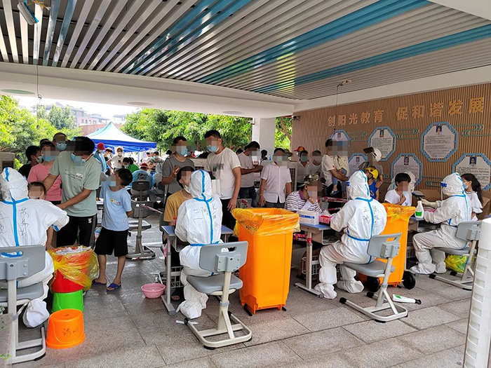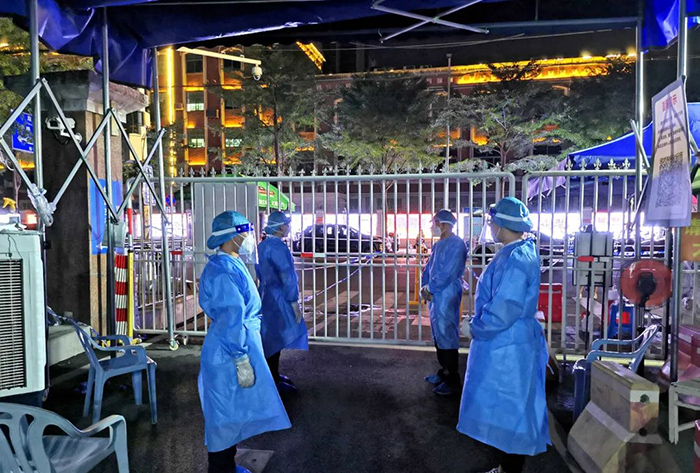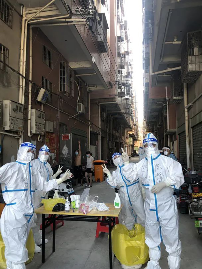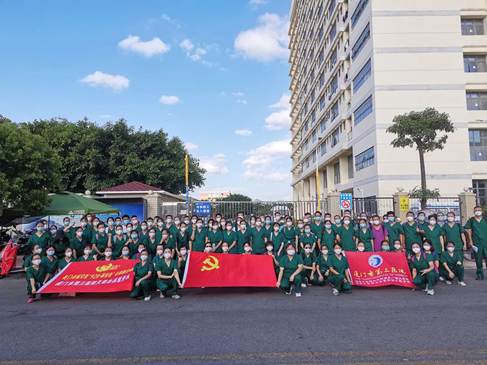 党委书记彭月芗、党委委员、副院长黄建隆在疫情大暴发期还承担同安区疫情防控前方指挥部的全区常规检测小组、核酸混检阳性应急采样小组、重点区域核酸检测小组、溯源流调小组等重点任务,几天几夜,不畏艰险,联系各方力量,组织采样突击队转载作战,以最快的速度完成上级指派的各项应急采样任务,为市区疫情防控指挥部采取有效措施,阻断社区疫情外溢赢得宝贵时间。 9月14日深夜,党委委员、副院长黄建隆临时接到通知,迅速赶赴新民镇乌涂坝仔铺驻点指挥、协调重点人群核酸混检阳性应急采样任务,带领以苏春花为队长的应急采样队一直工作到第二天晚上7点多,连续作战21个小时,稍休息片刻又继续战斗。组织队员在封控重点区域进行扫楼,入户核酸采样,以顽强的大无畏精神,展现出一名**产党员在关键的时候站得出来,豁得出去的可贵精神。 “身着‘大白’,徒步前行,最难受的已不是从头湿到脚,而是在包得严严实实的防护服内,在感觉缺氧的情况下还要回答群众提出的问题。”作为第一支被派到新民镇进行核酸采样队伍中的一员,党员、消化内科医生蔡素芳,带着队友们,先后前往西塘、梧侣、乌涂等社区进行核酸采样,最后扎根坝仔埔,与苏春花应急采样队会合,共同做好混阳、密接者的核酸采样,他们是一支当之无愧的抗疫突击队。 蔡素芳说,由于临时受命前往高风险地区,短期内无法回家,大部分人所带换洗的衣物并不多,为了避免感冒,大家只能采取上阵一套衣、下阵一套衣的策略。彻夜奋战疲惫不堪,队友们竭力克服,直接“猫”在纸箱里睡觉……无论多累,大家都自觉互助,帮即将上场的队友把好关,看是否防护到位。无论多难,他们都未曾退缩,最终在深夜完成了任务。