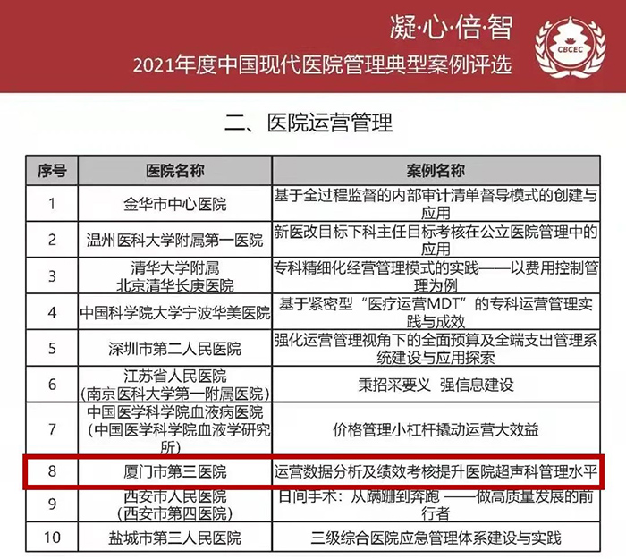 日前,2021年度中国现代伦理片 管理典型案例评选结果揭晓,伦理片 运营部申报的《运营数据分析及绩效考核提升伦理片 超声科管理水平》荣获“优秀奖”,这也是厦门市唯一获奖的项目。