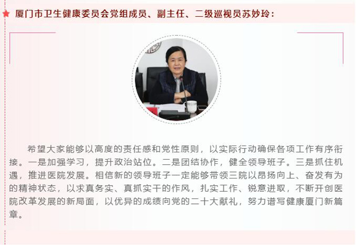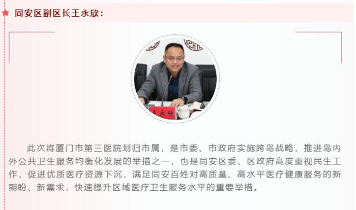 会上,厦门市卫生健康委员会党组成员、副主任、二级巡视员苏妙玲,同安区委常委、常务副区长李祖光,同安区副区长王永欣,厦门大学附属第一伦理片 党委书记李卫华等也分别作强调讲话。