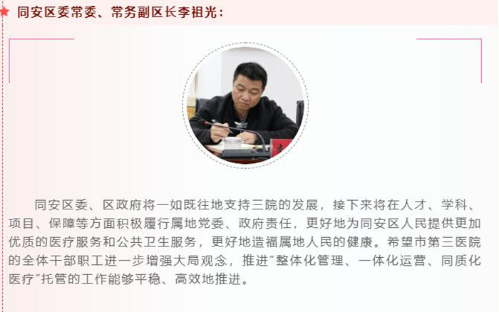 执行院长谢强表示,此次任职,既感荣幸,更感责任重大,接下来将通过“双主任”制、柔性引进人才政策等,提高短板科室的发展水平,更好地满足同安居民的医疗需求,推动三院发展迈上新台阶,优化同安营商环境。