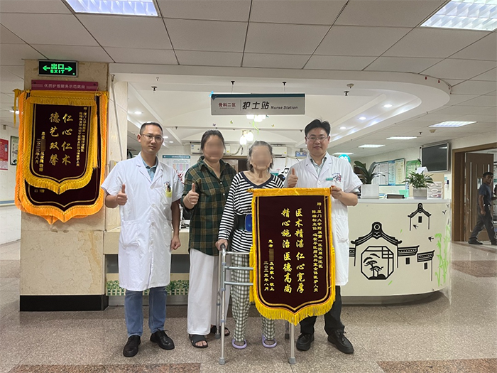 看着张阿婆重新“挺起脊梁”行走,家属感激不已,向陈瑞松团队送来锦旗表达感谢。