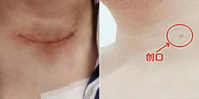 ▲左图:外科手术创口;右图:微波消融术创口。