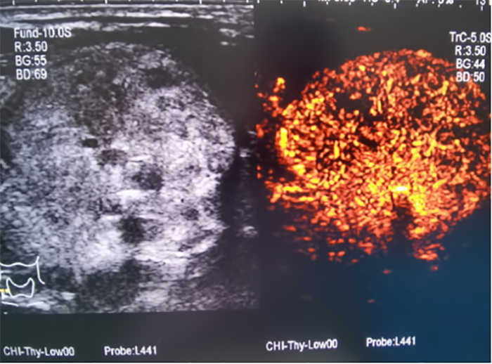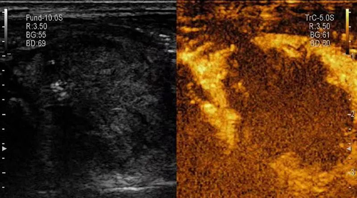 ▲消融前,超声造影提示甲状腺结节内部血供丰富,活性大。