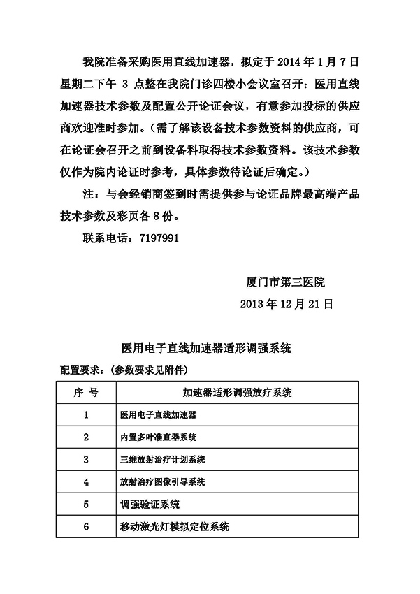 附件:设备参数配置 1、医用电子直线加速器: 1. 核心结构 技术及参数要求 1.1 设备型号 所投设备必需为新型医用直线加速器 1.2 微波功率源 磁控管或速调管 1.3 加速管加速原理 驻波 1.4 电子枪 可控栅极电子枪,不可拆卸方式,保证加速管高真空度≤10-7(Thorr) 1.5 磁偏转系统 270度消色散磁偏转系统或滑雪式磁偏转系统 1.6 计算机控制 加速器系统由计算机控制,具有晨检模式、治疗模式、物理模式和维修模式。 1.7 手控器 配备手控器,能控制机架、射野、治疗床等各种机械运动,具有速度可调功能。 1.8 操作输入 可通过键盘输入数值,机架、治疗头钨门自动运动到所输数值。 1.9 维修模式软件的密码 投标厂商应提供进入维修模式的密码。 1.10 机架类型 轴承式或滚筒式 1.11 X线和电子线的能量切换 全自动控制,没有任何机械部分 1.12 故障自动检测与提示功能 全方位计算机故障自动检测与提示功能 1.13 冷却系统 风冷却或水冷却系统 2 X射线束特性 2.1 X线能量 双光子6MV、10MV两档 2.2 X线最大剂量率 ≥250MU/min 2.3 X线最大剂量建成深度 SAD=100cm 10吆cm射野: 6MV: 1.6 ± 0.2cm 10MV: 2.4 ± 0.2cm 2.4 X线百分深度剂量 水下10cm,SSD=100cm10吆cm射野: 6MV: 67.0% ± 3.0% 10MV: 74.0% ± 3.0% 2.5 束流靶点直径 ≤1mm直径圆点 2.6 X射线野尺寸 2ࡨcm至40吤cm (SSD=100cm) 2.7 X线平坦度 所有能量的X线平坦度(100cm TSD下,10cm深处,10吆cm2到40吤cm2) ≤ 1.06 2.8 X线对称性 所有能量的X线对称性(100cm TSD下,10cm深处,10吆cm2到40吤cm2),≤ 1.03 2.9 准直器的射线透射剂量 ≤2% 2.10 X线泄漏 在垂直于射野中心轴并通过等中心的平面内,最大射野外,半径两米内辐射 ≤0.1%。 在其它所有的方向上,距离电子加速路径(电子枪与靶之间或电子枪与散射片之间)1 m处的X线吸收剂量,将不超过等中心处吸收剂量的0.1% 2.11 X线剂量率的稳定性 在两分钟内变化≤ۭ% 3 电子线束特性 3.1 电子线能量 电子辐特(MeV):6、8、9、10、12、14任选四档 3.2 电子线剂量率 ≥300 MU/min 3.3 电子线平坦度 (100cm TSD,10吆c㎡ 到25吕c㎡),≤ۮ.5% 3.4 电子线对称性 (100cm TSD,10吆c㎡ 到25吕c㎡),≤2% 3.5 电子线的X线污染 ≤10MeV时,≤3% >10MeV时,≤5% 3.6 电子线剂量率的稳定性 在两分钟内变化≤ۭ% 4 剂量监视系统 4.1 系统结构 穿透型双通道电离室 4.2 剂量的线性精度 ≤2% 4.3 同一剂量的重复精度 ≤0.7% 4.4 机架和机头旋转对剂量的影响 ≤2% 5 机械运动系统 5.1 机架旋转角度 175°~360۠°~185° 5.2 机架旋转速度 连续可调 5.3 TAD距离 100 ± 0.5cm 5.4 等中心精度 ≤۫mm 5.5 准直器系统旋转 265°~360۠°~95° 5.6 上独立准直器移动范围 -10cm~+20cm,-20cm~+10cm 5.7 下独立准直器移动范围 -2cm~+20cm,-20cm~+2cm 5.8 独立准直器的自动复位 当选择使用对称模式时,上下两对独立准直器系统能自动复位成对称位置。 5.9 光野与射野的一致性 ≤2mm。 6 精确治疗床 6.1 运动控制 调速电机控制,运动速度可调 6.2 手动控制 所有的治疗床运动均能由手动方式控制 6.3 负载能力 ≥200千克 6.4 垂直移动范围 70~150cm,误差≤0.25cm 6.5 前后移动范围 110cm,误差≤0.2cm 6.6 左右移动范围 -24cm~+24cm,误差≤0.2cm 6.7 治疗床的等中心旋转 265°~360°,0°~95°旋转等中心误差≤۫mm 6.8 治疗床面板 床面整体采用碳纤维材料 2、内置多叶准直器(MLC) 序号 技术及参数要求 1 MLC安装方式 永久内置安装 2 MLC参数 2.1 MLC叶片数目 ≥80片 2.2 MLC最大辐射野 30cm吤cm 2.3 MLC最大(常规)射野 40 cm吤cm 2.4 叶片厚度:投影到正常治疗距离处的尺寸 ≤1cm 2.5 等中心处叶片过中线距离 ≥14cm 2.6 同一箱体叶片最大位置差 ≥15cm 2.7 片间漏射剂量 <2% 2.8 光栅重量 ≤ 105kg 2.9 MLC叶片厚度 ≤ 7.0cm 2.10 MLC在SAD过中线距 ≥6.5cm 2.11 MLC叶片运动速度 ≥10mm/s 2.12 MLC箱体运动速度 ≥7mm/s 2.13 MLC叶片到位精度 ≤ 1mm 2.14 MLC半影 ≤ 0.7cm 3、三维放射治疗计划系统 序号 技术及参数要求 一 软件系统配置 1 治疗野设计模块 1.1 对称矩形野设计 1.2 非对称矩形野设计 1.3 楔形野设计 1.4 挡块不规则野设计 1.5 多叶准直器不规则野设计 2 治疗野临床设置模块 2.1 对称野手动及自动设置 2.2 非对称野手动及自动设置 2.3 照射设置 2.4 适形照射野设置 2.5 MLC照射野设置 2.6 机架角、机头角、床角显示 3 图形图像的输入和配准模块 3.1 胶片输入 3.2 DICOM 3.0协议的CT数据输入 3.3 图像定位 4 人体器官定义、器官轮廓的勾画和编辑模块 增加、删除、名称编辑、密度编辑、颜色编辑、类型编辑、名称的历史记录保存、体表自动提取、复制、移动、删除、自动提取、编辑、多边形勾画、椭圆勾画、矩形勾画 5 三维治疗计划设计模块 多野共面照射、多野非共面照射、SSD照射、SAD照射技术、多病灶治疗计划设计、多靶点治疗计划设计、多计划比较 6 三维剂量计算模块 剂量计算、剂量自动修正、归一化方式选择、处方计算 7 三维剂量逆向调强计算模块 器官约束条件的选择和设置、器官软约束处方剂量的设置、器官软约束权重的设置、器官DVH约束剂量-体积约束点的设置、器官DVH约束剂量-体积约束点的删除、强度分布的自动计算、MLC子野离散化的自动计算、子野照射跳数的自动计算、调强照射结果剂量分布的自动计算、MLC透射的自动修正、MLC驱动文件的自动生成、SIMRT快速调强计算模块、IMRT计划验证模块、MLC子野形状浏览、总的注量分布图的三维彩色显示、注量三维分布图的放大和缩小、总注量分布图的