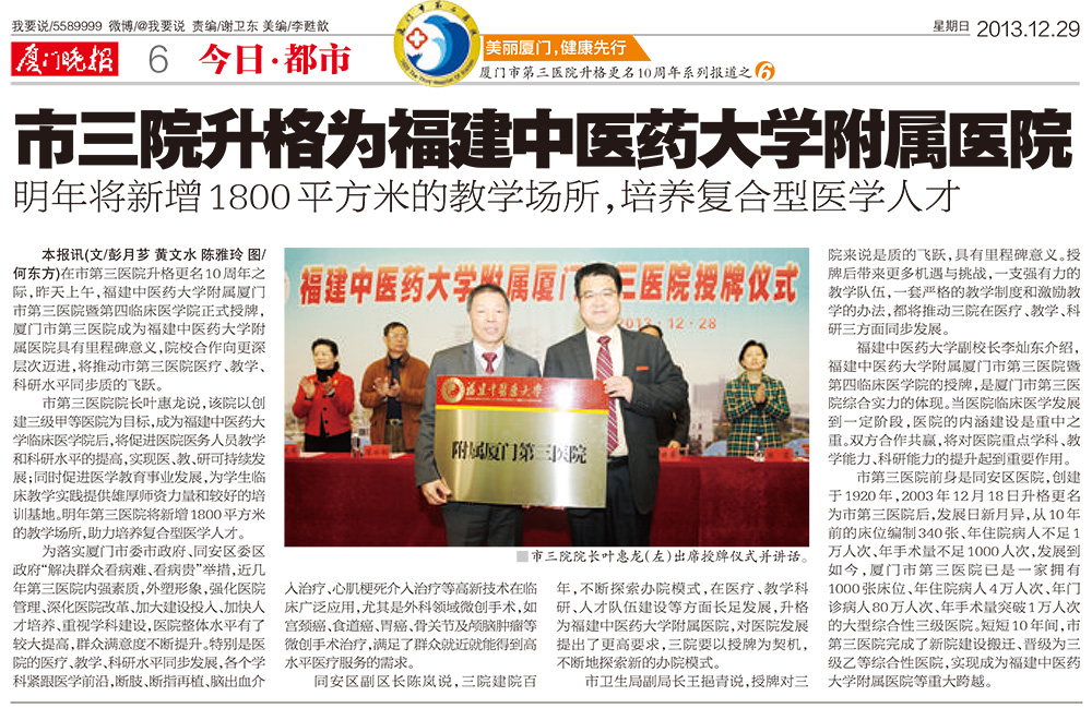 20131229晚报 报道6 市三院升格为福建中医药大学附属伦理片