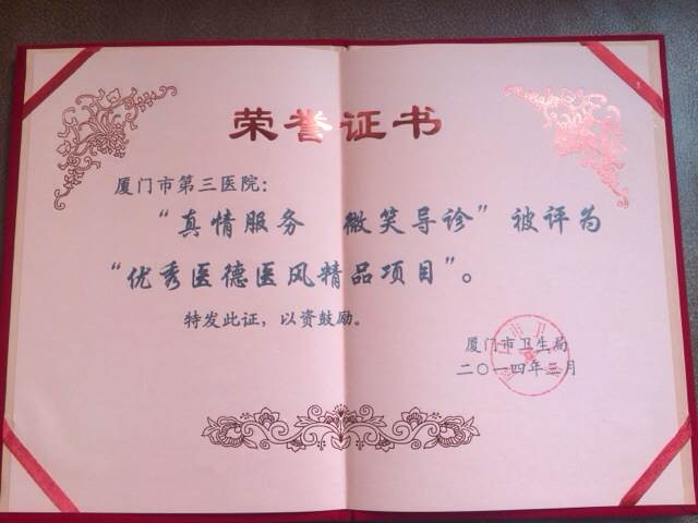 4月3日上午,厦门市卫生局表彰一批党风廉政建设、行风建设先进集体及优秀医德医风精品项目。伦理片 获“行风建设先进集体”、“真情服务、微笑导诊”医德医风精品项目殊荣。