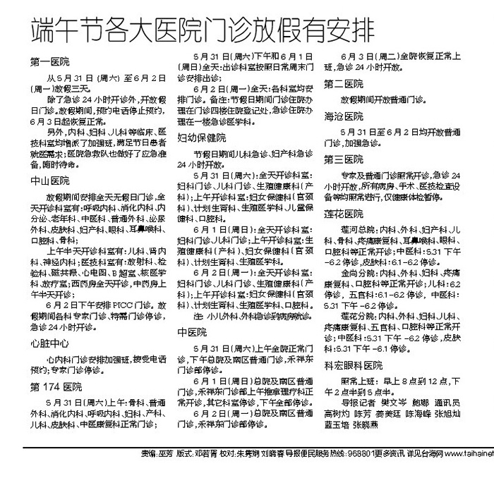 伦理片 常年无假日,端午节假日期间专家及普通门诊照常开诊,急诊24小时开放,所有病房、手术、医技检查设备等均照常进行,仅健康体检暂停。