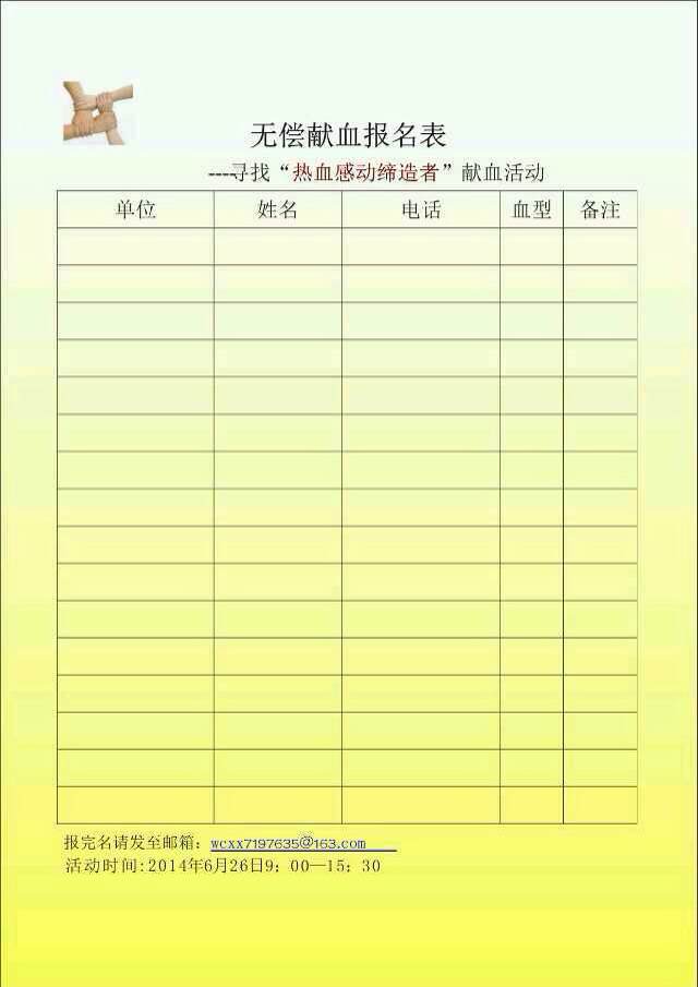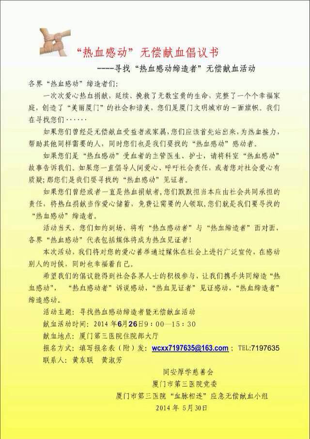6月26日上午9:00一15:30,在伦理片 住院部,热血感动缔造者\感动者\见证者见面活动及无偿献血将如期举行,感动故事将在那里发生,欢迎爱心的各界人士\新闻媒体\医护人员\家属及代表参加。