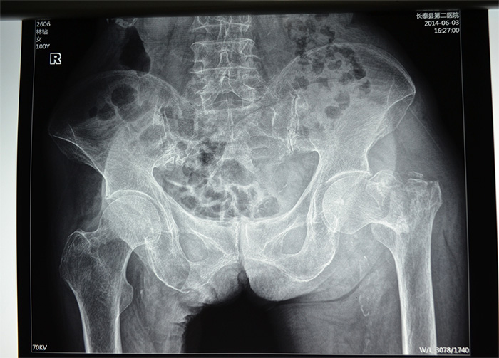 拍片,发现左腿髋部骨折严重,且错位明显。考虑患者高龄,骨折严重,手术风险高,技术难度大,当地伦理片