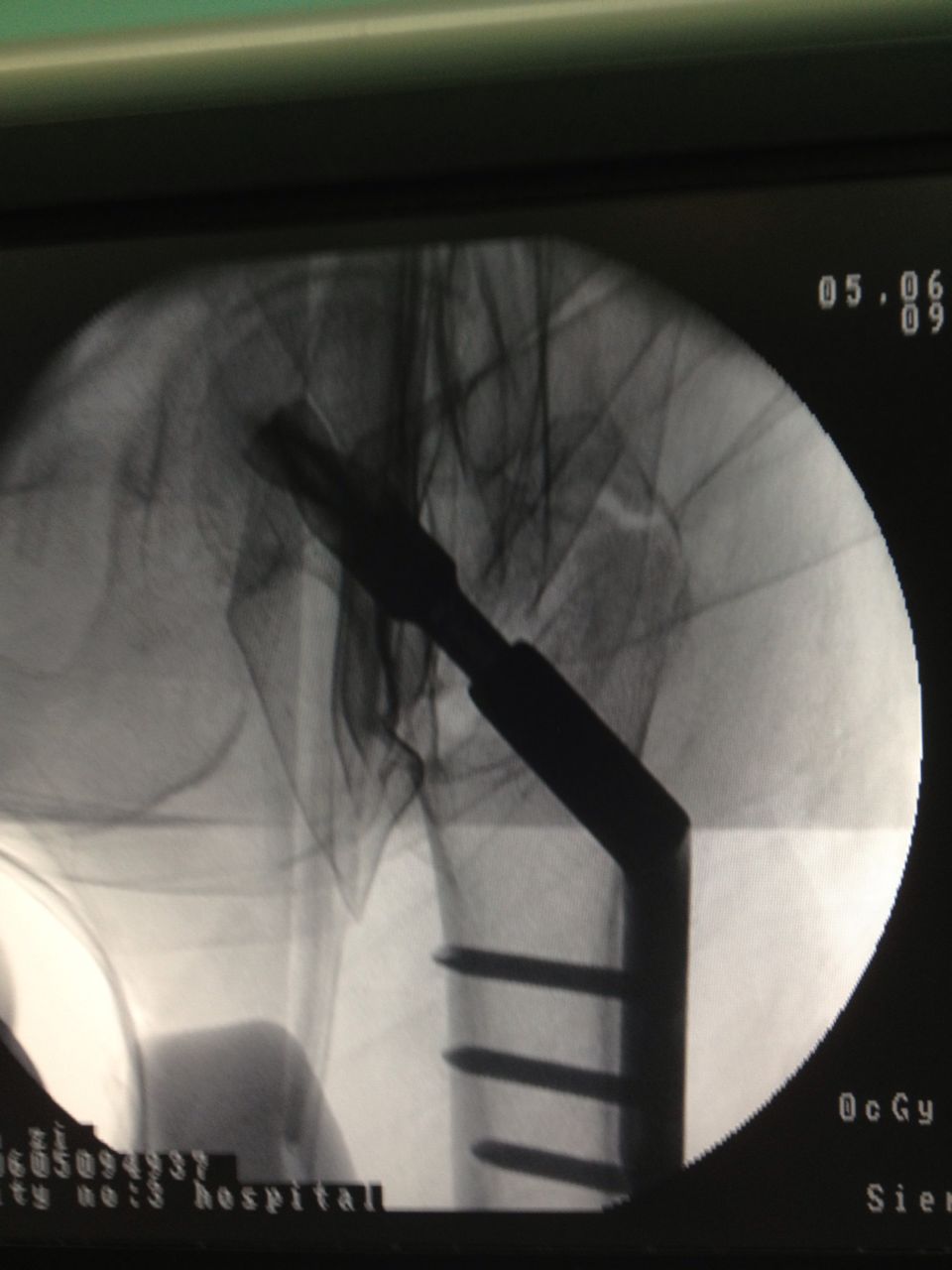 林老太入三院时,左腿的髋部骨折处已翻转90度,还出现短缩移位,左腿比右腿短了5—6公分。由于疼痛,每次大小便,对老人来说都是一次折磨,她也不敢正常摄入食物,导致出现低蛋白,且原先就有高血压的症状,心血管功能比较差,手术风险极高,如果采用传统的骨折开放复位钢板固定术,对于高龄特别是骨质疏松患者,手术失败率很高,同时卧床时间长达三四个月,极易引发并发症。骨科主任刘忠国说。
