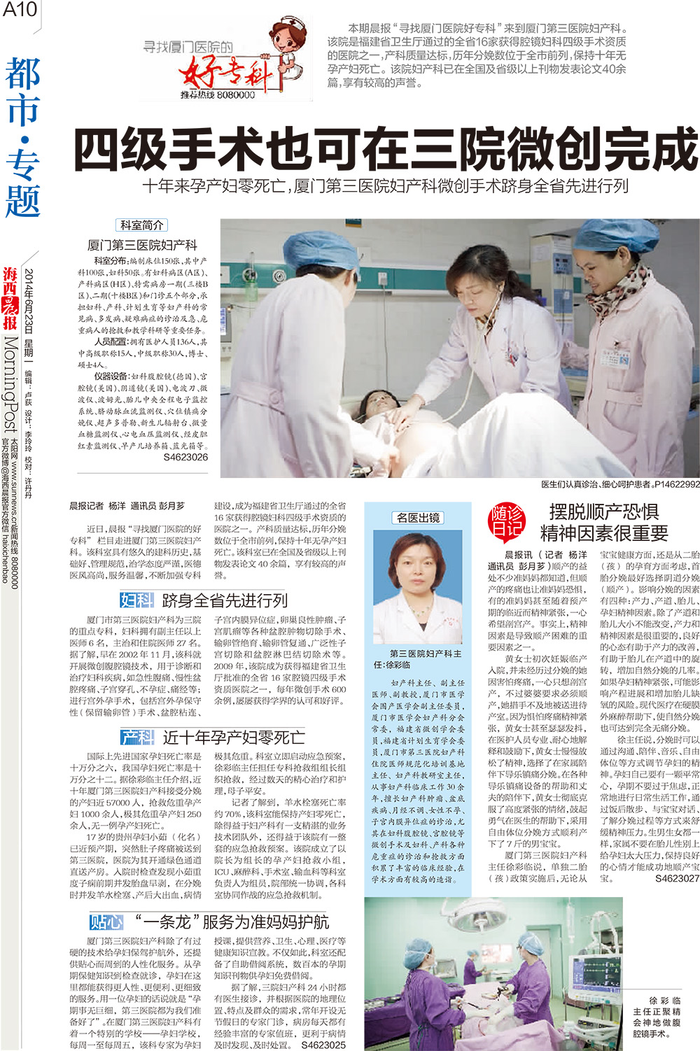 《寻找厦门伦理片 的好专科》------厦门第三伦理片 妇产科,具有悠久的建科历史,基础好、管理规范,治学态度严谨,医德医风高尚,服务温馨,三院妇产科是福建省卫生厅通过的全省16家获得腔镜妇科四级手术资质的伦理片 之一。产科质量达标,历年分娩数位于全市前列,保持十年无孕产妇死亡,在社会享有较高的声誉。