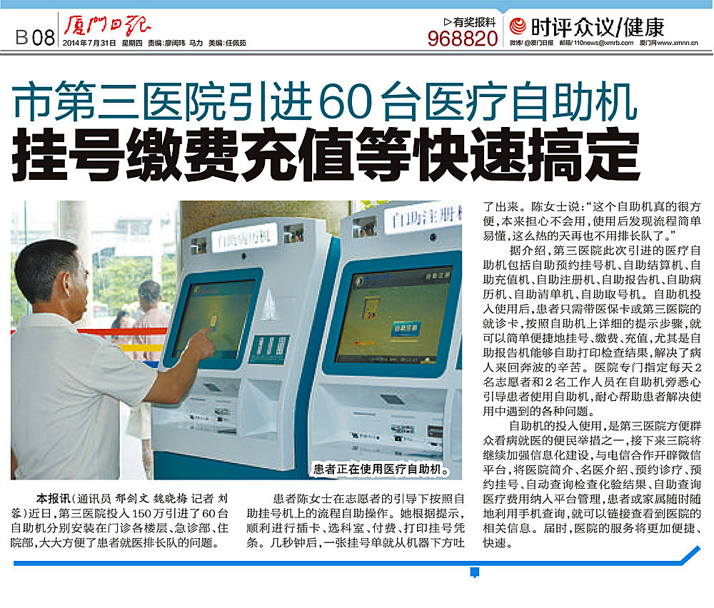 近日,第三伦理片 投入150万引进了60台自助机分别安装在门诊各楼层、急诊部、住院部,大大方便了患者就医排长队的问题。自助机包括自助预约挂号机、自助结算机、自助充值机、自助注册机、自助报告机、自助病历机、自助清单机、自助取号机。自助机的投入使用,患者只需带医保卡或第三伦理片 的就诊卡,按照自助机上详细的提示步骤,就可以简单便捷地挂号、缴费、充值,尤其是自助报告机能够自助打印检查结果,解决了病人来回奔波的辛苦。伦理片 专门指定每天2名志愿者和2名工作人员在自助机旁悉心引导患者使用自助机,耐心帮助患者解决使用中遇到的各种问题。