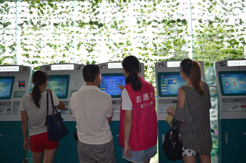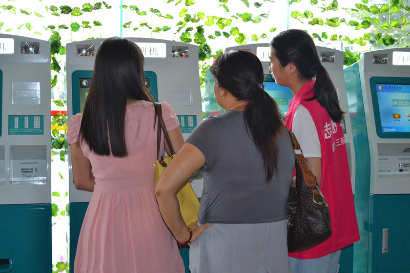 一位陈姓女士在志愿者的引导下按照自助挂号机上的流程自助操作。她根据提示,顺利进行插卡、选科室、付费、打印挂号凭条。几秒钟后,一张挂号单就从机器下方吐了出来。陈女士说:“这个自助机真的很方便,本来担心不会用,使用后发现流程简单易懂,这么热的天再也不用老排长队了。”