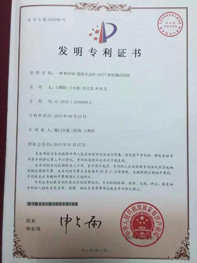 伦理片王顺旺医师发明的【MTHFRD基因多态性C677的检测试剂盒】获批专利