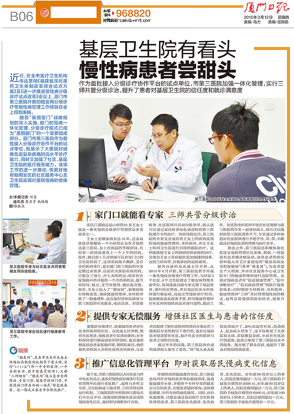 近日,在全市医疗卫生机构传达贯彻《福建省深化医药卫生体制改革综合试点方案》及《进一步推进慢性病分级诊疗试点改革》的会议上,厦门第三伦理片 开展的糖友网分级诊疗等慢性病管理工作经验在会上得到表扬。