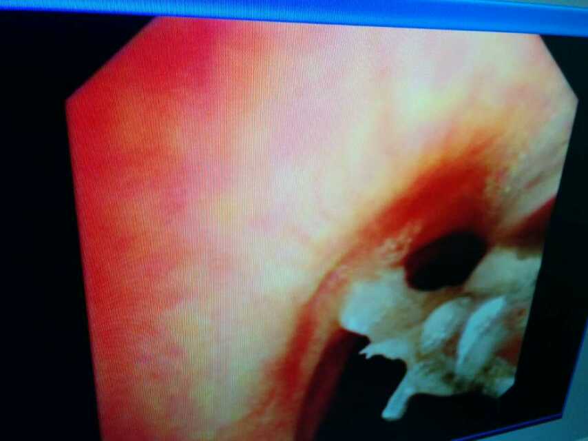 孙志强说,在气管镜下观察到,施女士的右肺中间段有异物,出现化脓感染的情况,经过处理,终于看清了:右肺中间段支气管里有一块扁骨,长1厘米,宽0.5厘米。10多分钟后,经气管镜下取出了骨头,那是一块带鱼头部的扁骨,与施女士之前描述的情况吻合,“现在不咳了,感觉整个人轻松许多。”她说,没想到,10多分钟的治疗,解决了一个月的困扰。孙志强介绍,若没有及时处置,施女士肺部的管腔几乎被完全堵塞,时间久了,肺里的鱼骨还可能滑动,刺中肺里的大血管引发大出血。