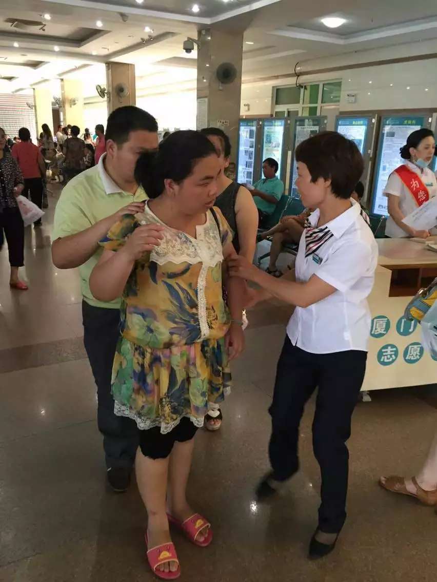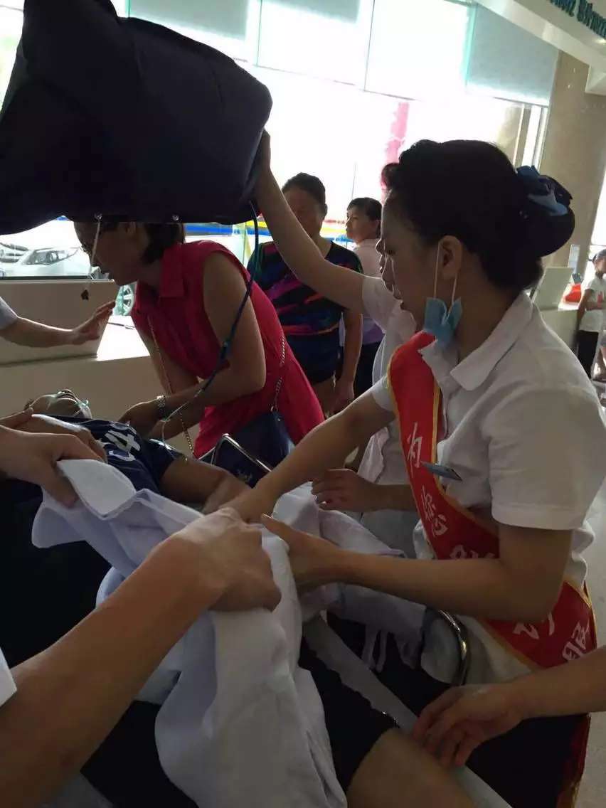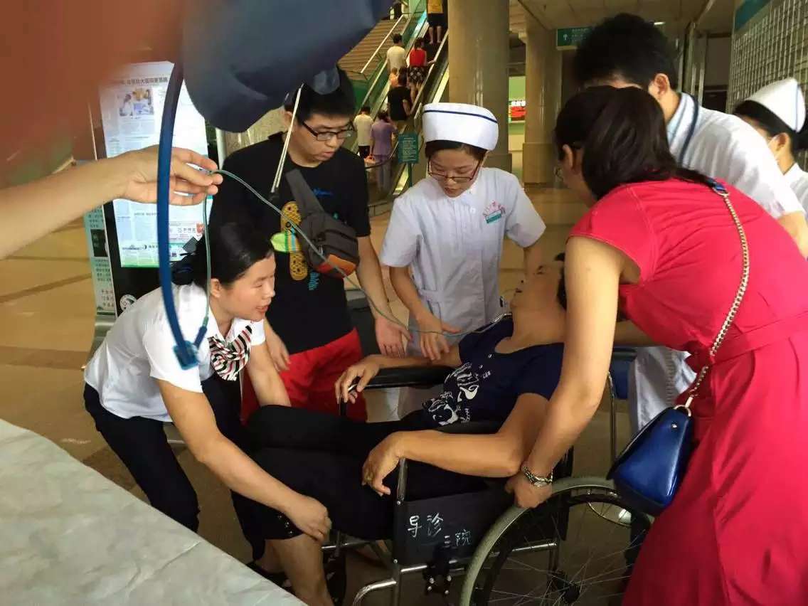 6月22日上午9点多,刚好是门诊最繁忙的黄金时间,有一位发高烧的苏阿姨突然大汗淋漓,气喘吁吁,晕倒、神志模糊。就在这时,客服中心人员李丽燕立即迎上去,并报告医生及护士长“有人晕倒了”,请求帮助,这时患者的家属已不知所措。呼吸一科主任孙志强与护士长方文剪闻讯后,立即与导诊人员火速投入紧张抢救,有的给氧,有的推平车,有的……