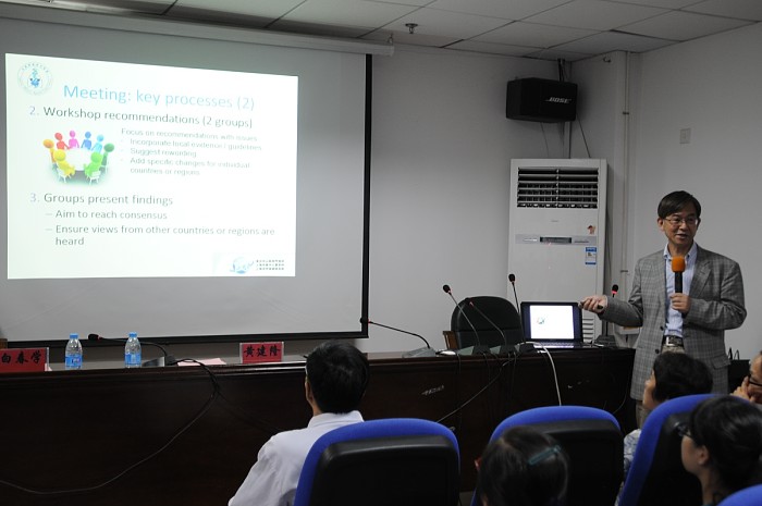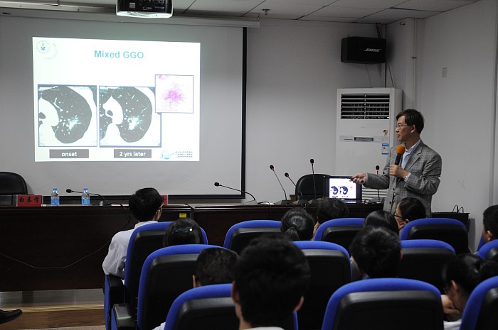 黄建隆副院长代表伦理片 在仪式上致欢迎辞,为白春学教授一行介绍了三院发展历史及在肺癌防治方面工作进展情况。