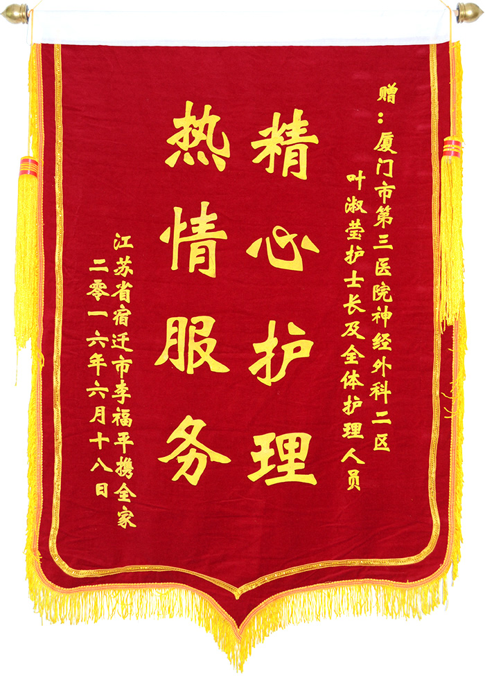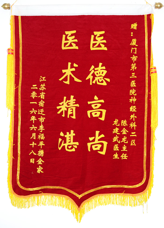 6月27日上午,快递给第三伦理片 送来了一份特别的礼物,打开一看,原来是从江苏省宿迁市寄来的两面锦旗。其中一面锦旗是赠送给神经外科二区陈金龙主任、龙建武医生,称赞他们“医德高尚、医术精湛”,另一面赠送给叶淑莹护士长及全体护理人员,称赞她们“精心护理、热情服务”。