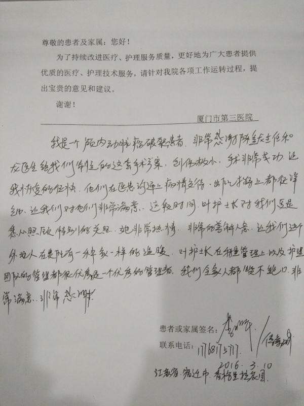 出院前患者及家属在病人意见本上留言:我是一个颅内动脉瘤破裂患者,非常感谢陈金龙主任和龙医生给我们制定的这套手术方案,创伤极小,手术非常成功,让我恢复得很快,他们在医患沟通上、病情交待、出院指导上都很详细,让我们对他们非常满意,这段时间,叶护士长对我们更是细心照顾,特别的关照,她非常热情,非常的善解人意,让我们这个外地人在贵院有一种家一样的温暖。叶护士长在科室管理上以及护理团队的管理都很优秀,是一个优秀的管理者,我们全家人都赞不绝口,非常满意,非常感谢!