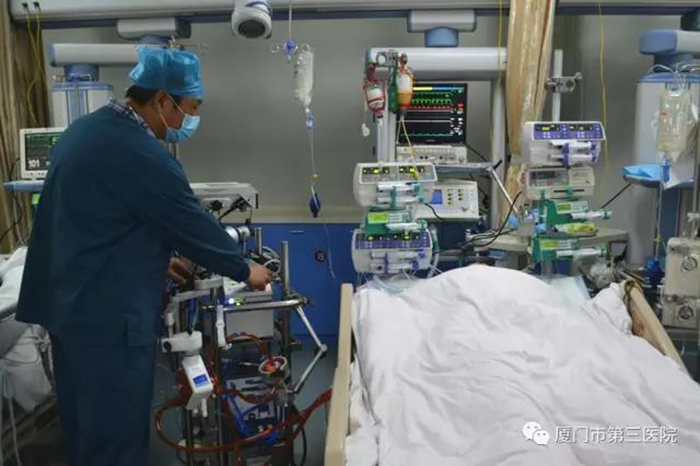 近日,三院还引进了体外膜肺氧合(ECMO)。这是一项重症医学专业中目前顶尖的生命支持技术之一,由于仪器先进、操作复杂,能增加患者救治成功机率,厦门开展此技术的伦理片 寥寥无几。它还被称为叶克膜,即体外膜肺氧合技术,是通过建立体外循环,将患者血液引至体外,通过人工膜肺实现氧气和二氧化碳的体外交换,从而替代患者的肺脏甚至部分替代患者的心脏功能,能为心肺功能衰竭的患者提供强大的生命支持。主要适用于可逆性的心肺功能衰竭患者,尤其适用于严重ARDS、急性心肌炎等心源性休克的患者,是抢救危重症患者生命最重要的技术。