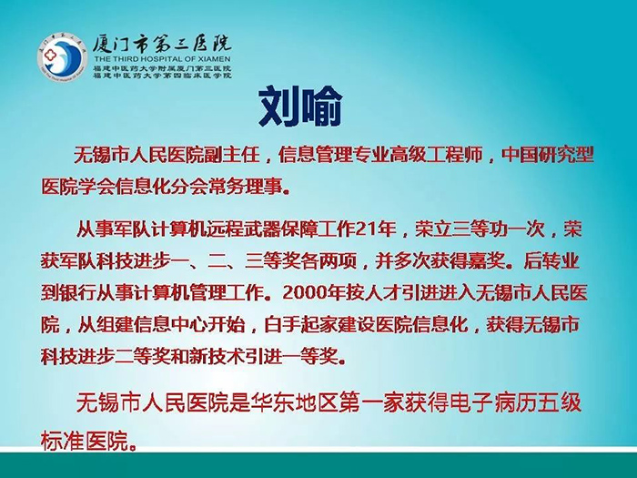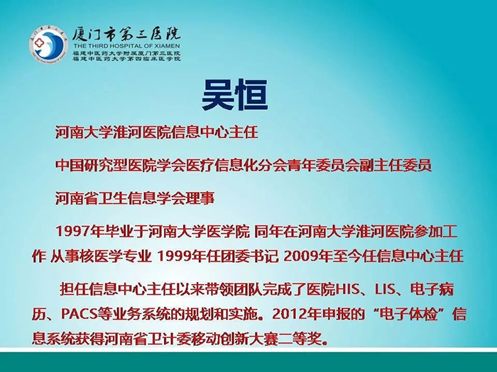 河南大学淮河伦理片 信息中心吴恒主任分享了数字化伦理片 评审与伦理片 信息化建设经验,河南省把信息化建设作为等级伦理片 评审的入门条件,这种作法值得借鉴。信息对伦理片 的建设至关重要,尤其医联体的建设,要成立几大中心,包括区域心电中心、影像中心、物流中心、供应中心等,只有信息化的互联互通,才能确保政令畅通,起到事半功倍的效果。