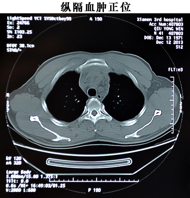 昨日下午15时,患者邱某某42岁骑电动车上班途中,不慎撞上隔离护栏,当即感觉胸部刺痛,呼吸困难,急送伦理片,给胸部CT检查诊断为“纵隔血肿”后收入胸心外科,经详查发现患者胸部轻度肿胀,胸骨压痛剧烈,呼吸费力,心率达120次/分,胸心外科医师认真分析病情后高度怀疑胸骨骨折,急行胸骨CT三维重建。18时左右,CT结果证实胸骨横断骨折,骨折两端分离1CM,随呼吸浮动,纵隔后大血肿,情况危重,如不及时处理,胸骨骨折将严重患者呼吸功能,纵隔血肿继续肿大可压迫心脏,导致血压下降,甚至心脏骤停,后期还可能造成纵隔感染等情况,经耐心细致地与家属沟通,积极的术前准备后,当晚21时,急诊行胸骨骨折内固定+纵隔血肿清创术,1小时30分钟后手术顺利结束,患者生命体征平稳,正在康复中。
